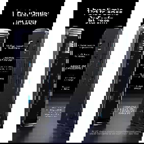 USB-C HUB pretvara jedan USB-C u 2x 4K HDMI, 1x 5 Gbps USB-C, 1x 5 Gbps USB-A, 2x 480 Mbps USB-A, 1x USB-C PD-IN, 1x Ethernet priključak, 1x utor za SD karticu i 1x USB-C up stream priključak Ethernet priključak omogućuje stabilnu vezu i brzine do 1