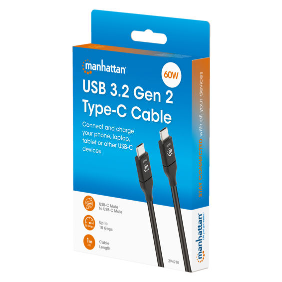 Kabel MANHATTAN 394918, USB-C na USB-C, USB 3.2 Gen 2, 10 Gbps, 60W, 1m, Crni